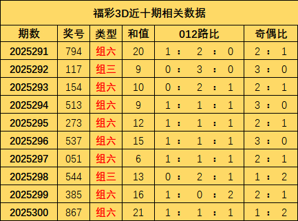 类型分析:上期开出中奖号867,为组六类型,最近十期开出组六类型8期,开出组三类型2期。详尽分析,组六类别出现机率大,本期预测开出组六号码。