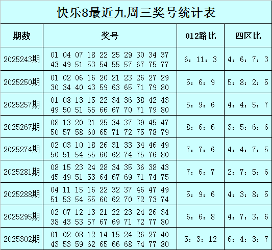 福彩承诺8第2025302期(上周三)开奖追忆:01 02 08 12 14 15 24 26 27 40 43 53 59 62 65 66 68 74 77 80,其中奖号四区比为6:4:3:7,012路比为5:3:12。