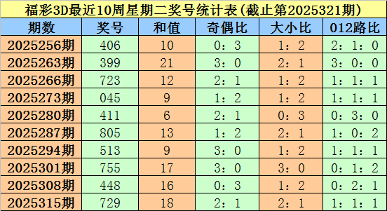 福彩3D第2025315期(上周星期二)奖号为729。其中奖号奇偶比为2:1,大小比为2:1,012路比为1:1:1。